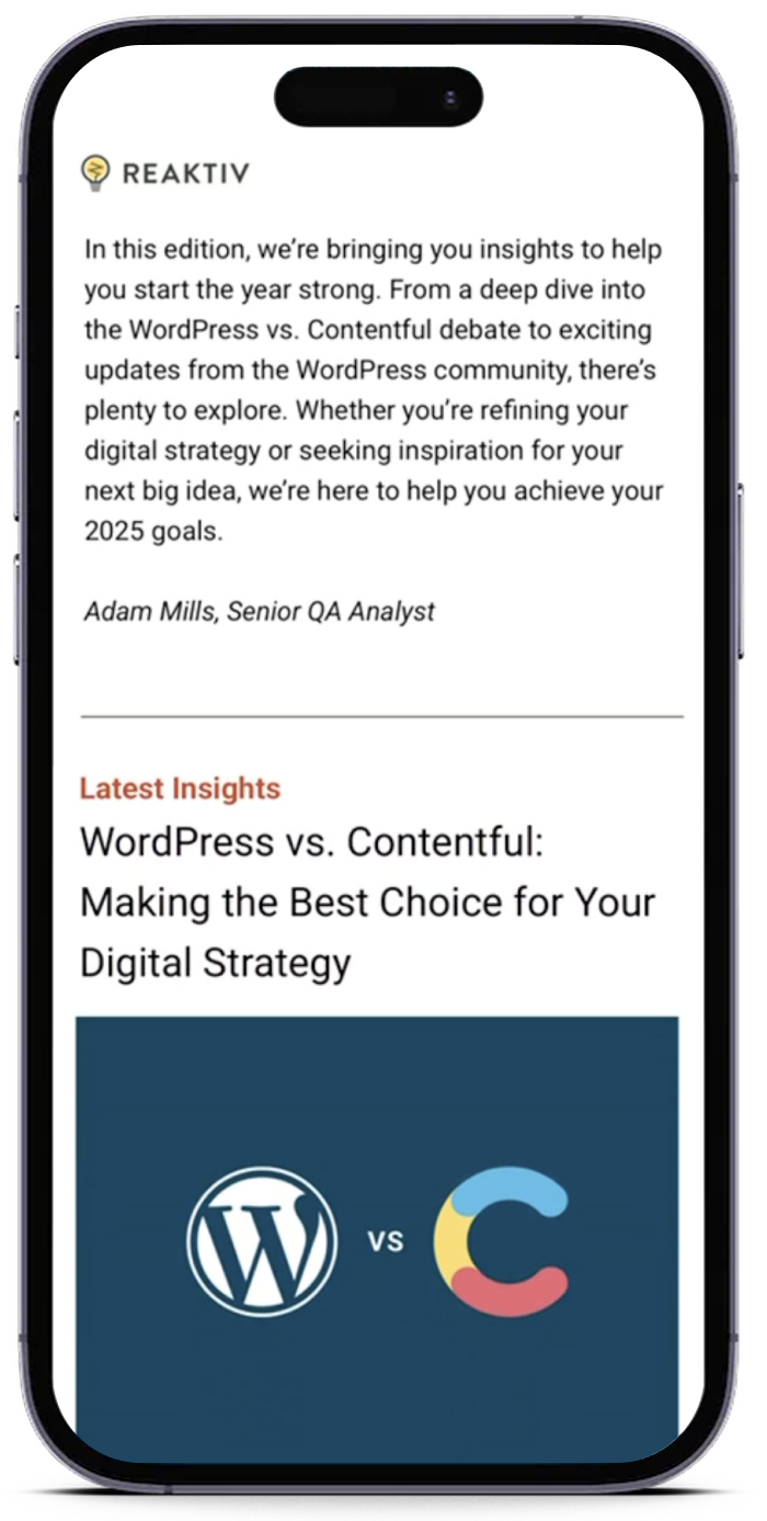 Every issue of the Reaktiv Newsletter is built to be short, thoughtful, and useful. We focus on the kinds of topics that come up when you’re running a complex, high-traffic WordPress platform—whether you’re leading marketing, product, or engineering.